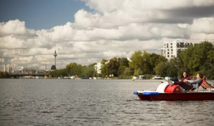 • Frauenpärchen beim Tretbootfahren