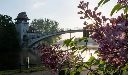 Die Abteibrücke gilt als eine der ersten Stahlbetonbrücken Deutschlands und führt als Fußgängerüberweg auf die Insel der Jugend.