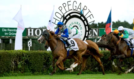 vlnr Jockey Stephen HELLYN auf Pferd SIRIUS 9 vor Jockey Frederik TYLICKI auf Pferd BERLIN BERLIN Jockey Adrie de VRIES auf LUCKY SPEED 4
