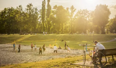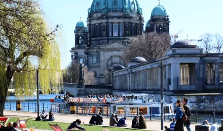 Chillen in der Ampelmann Strandbar im James-Simon-Park mit Blick auf Berliner Dom