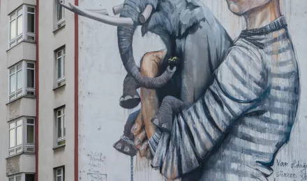 Beim «Berlin Mural Fest» entstanden über 80 neue Streetart-Kunstwerke in der ganzen Stadt. Dieses ist eins der bemalten Häuser. James Bullough und das Künstler-Duo Telmo Miel waren drei der zahlreichen Künstler/innen, die für das UNITY-Projekt von URBAN NATION eine der ONE WALLS gestaltet haben.