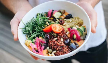 Das Restaurant Daluma serviert Smoothies und kalt-warme vegane Menüs bis abends in der angesagten Saftbar im reduzierten Design.