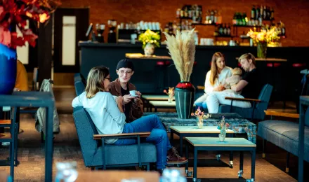 Restaurant Bonvivant in Berlin (Cocktailbistro/Lifestyle). Innenansicht mit rundem Tisch für mehrere Personen. Raum mit diversen Grünpflanzen dekoriert.