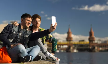 Gay-Pärchen erkundet Berlin-Friedrichshain, Spreeufer an der Oberbaumbrücke