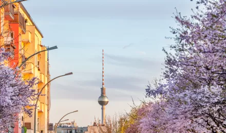 Kirschblüten in voller Pracht in der Nähe der Bornholmer Brücke - Entlang dem Berliner Mauerweg und sonstigen Orten in Berlin sowie anderen Regionen wie Potsdam wurden nach der Wiedervereinigung Tausende von japanischen Kirschbäumen aufgrund einer grosszügig angelegten Spendenaktion in Japan durch den japanischen Fernsehsender TV Asahi Corporation, die 1 Millionen Euro erbrachte, angepflanzt (sakura campaign). Aus Freude über den Fall der Mauer wurden diese Mittel in japanischen Kirschbäumen, bzw. zur Anschaffung von Kirschbäumen von den Spendern bestimmt.