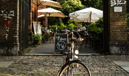 Dezent in Weiß und Schwarz gehaltenes Friedhofscafé mit Snacks und Gebäck sowie Terrasse mit Blick ins Grüne.