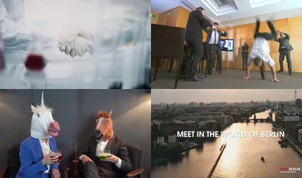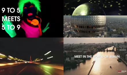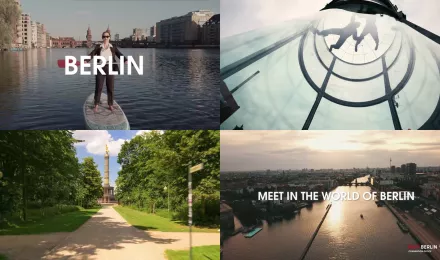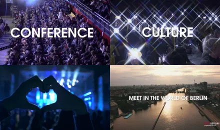 The long version of the video shows in different scenes that Berlin is the perfect major event location - also before and after the congress. Thus, our motto appears in different versions: Travel to meets Ride Through, Event meets Location, Conference meets Culture, Design meets Hotel, Green City meets Green Minds, Science meets Art, Art meets Architecture, 9 to 5 meets 5 to 9, Green Catering meets Sustainable Stay, Ice meets Breaker and Convention meets Berlin.
