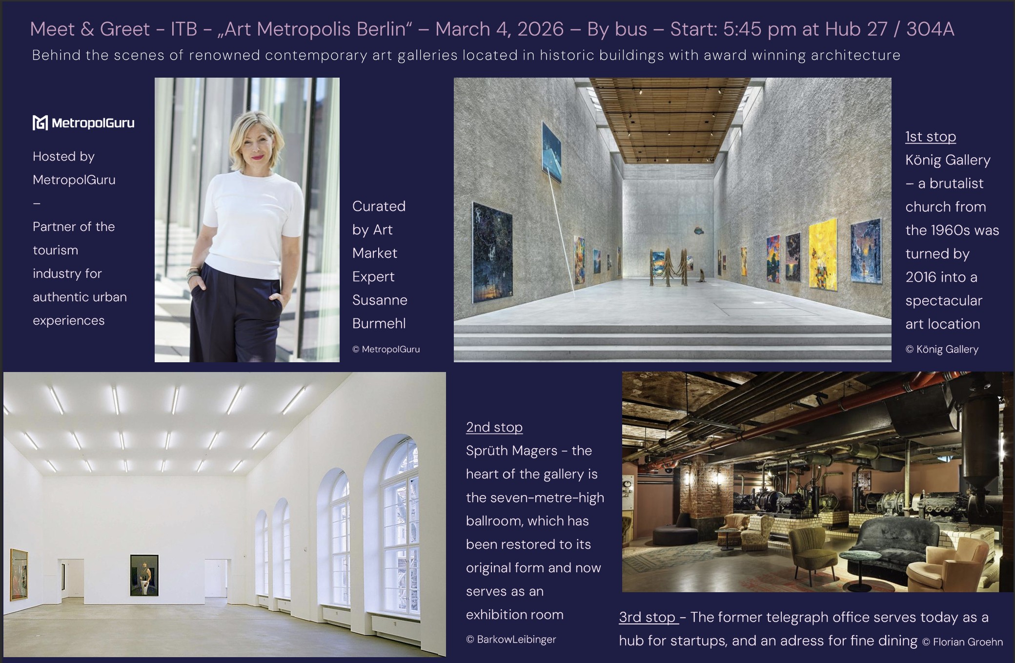 Art Metropolis Berlin is an exclusive ITB Berlin experience on March 4, 2026, curated by art market expert Susanne Burmehl. The behind-the-scenes program offers tourism professionals a guided visit to two of Europe's leading contemporary art galleries — König Galerie, with a personal welcome by owner Johann König, and Sprüth Magers, including access to non-public areas. The evening concludes with a private culinary experience at the historic Telegraphenamt.