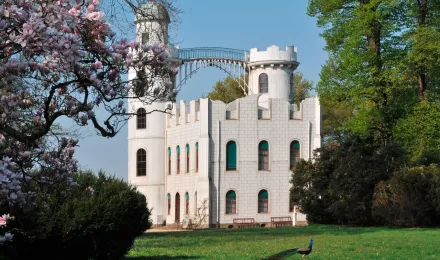 • Berlin, Pfaueninsel, Schloss mit Pfau und blühender Magnolie.