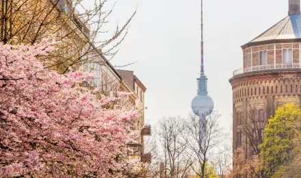Kirschblüten vor dem Hintergrund des Fernsehturms