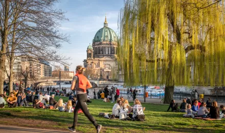 Menschen entspannen sich im Lustgarten vor dem Berliner Dom