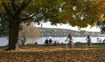 Blick vom Ufer der Havel in Gatow auf den Grunewald und den Grunewaldturm im Herbst