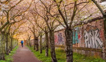 Kirschblüten in voller Pracht in der Nähe der Bornholmer Brücke - Entlang dem Berliner Mauerweg und sonstigen Orten in Berlin sowie anderen Regionen wie Potsdam wurden nach der Wiedervereinigung Tausende von japanischen Kirschbäumen aufgrund einer grosszügig angelegten Spendenaktion in Japan durch den japanischen Fernsehsender TV Asahi Corporation, die 1 Millionen Euro erbrachte, angepflanzt (sakura campaign). Aus Freude über den Fall der Mauer wurden diese Mittel in japanischen Kirschbäumen, bzw. zur Anschaffung von Kirschbäumen von den Spendern bestimmt.