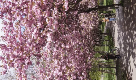 Kirschblüten in voller Pracht in der Nähe der Bornholmer Brücke - Entlang dem Berliner Mauerweg und an sonstigen Orten in Berlin und an anderen Regionen wie z.B. Potsdam wurden nach der Wiedervereinigung Tausende von japanischen Kirschbäumen auf Grund einer grosszügig angelegten Spendenaktion in Japan durch den japanischen Fernsehsender TV Asahi Corporation, die 1 Millionen Euro erbrachte, angepflanzt ( sakura campaign). Aus Freude über den Fall der Mauer wurden diese Mittel in japanischen Kirschbäumen, bzw.zur Anschaffung von Kirschbäumen von den Spendern bestimmt.