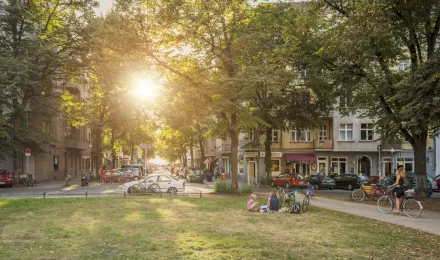 Neukölln, Schillerkiez, Herrfurthplatz, Blick in die Herrfurthstrasse zum Eingang Tempelhofer Feld