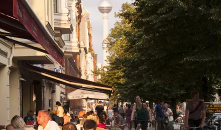 Straßencafe in der Oranienburger Straße, im Hintergrund der Berliner Fernsehturm