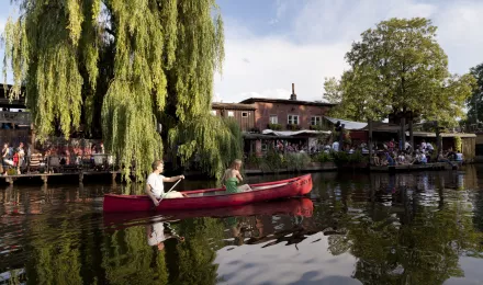 Mit dem Kanu unterwegs auf dem Flutgraben zwischen Treptow und Kreuzberg, vorbei an Szeneclubs wie dem Club der Visionäre