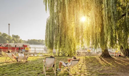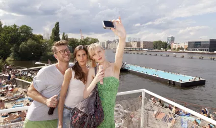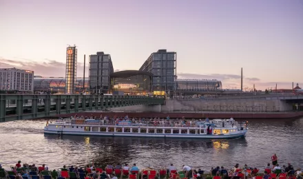 Strandbar Capital Beach mit Blick auf den Hauptbahnhof