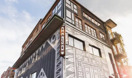 Bar im begrünten Gemeinschafts-Dachgarten auf einem Parkhaus, wo beliebte DJs Funk, Soul und Elektro spielen.